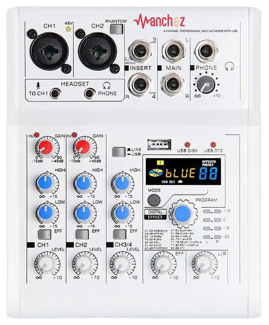 Manchez E4 - USB мікшерна консоль / аудіоінтерфейс. Гнучке керування рівнем вхідного сигналу, верхніми та нижніми частотами та гучністю. Всі вищезгадані функції регулюються для кожного каналу окремо.